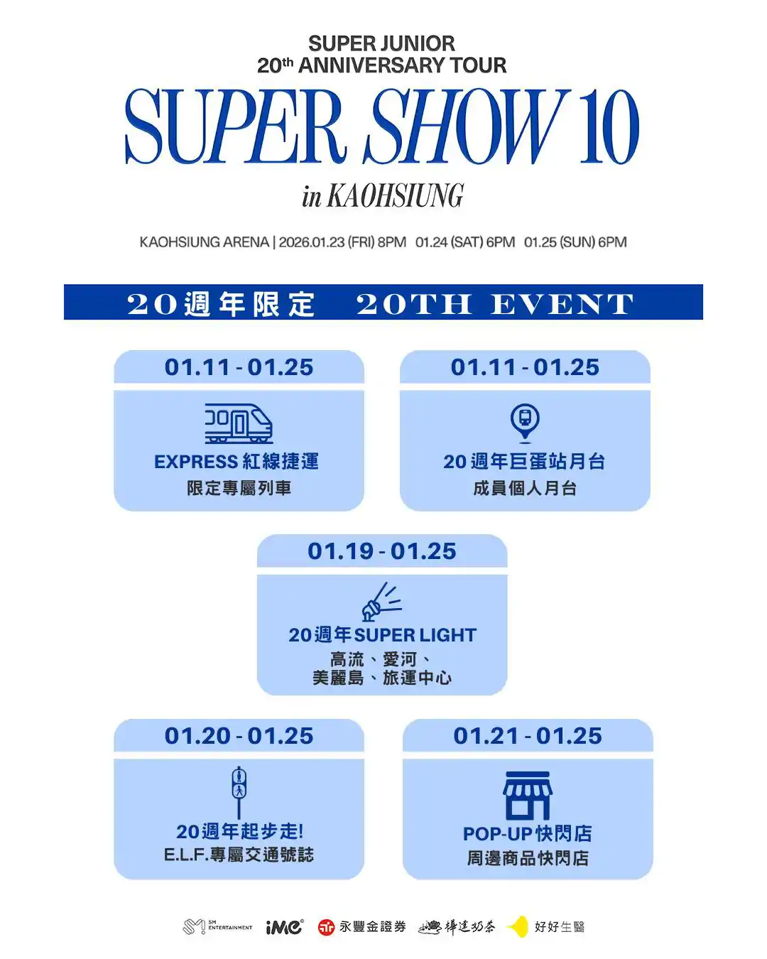 Super Junior 演唱會 Super Show 10 高雄場將在 1/23 至 1/25 在高雄巨蛋開唱,高雄特別推出 20 週年應援活動。即日起至 1/25,高捷巨蛋站設置成員個人月台,紅線捷運則有專屬列車,讓 SJ 成員陪粉絲們一同搭車。